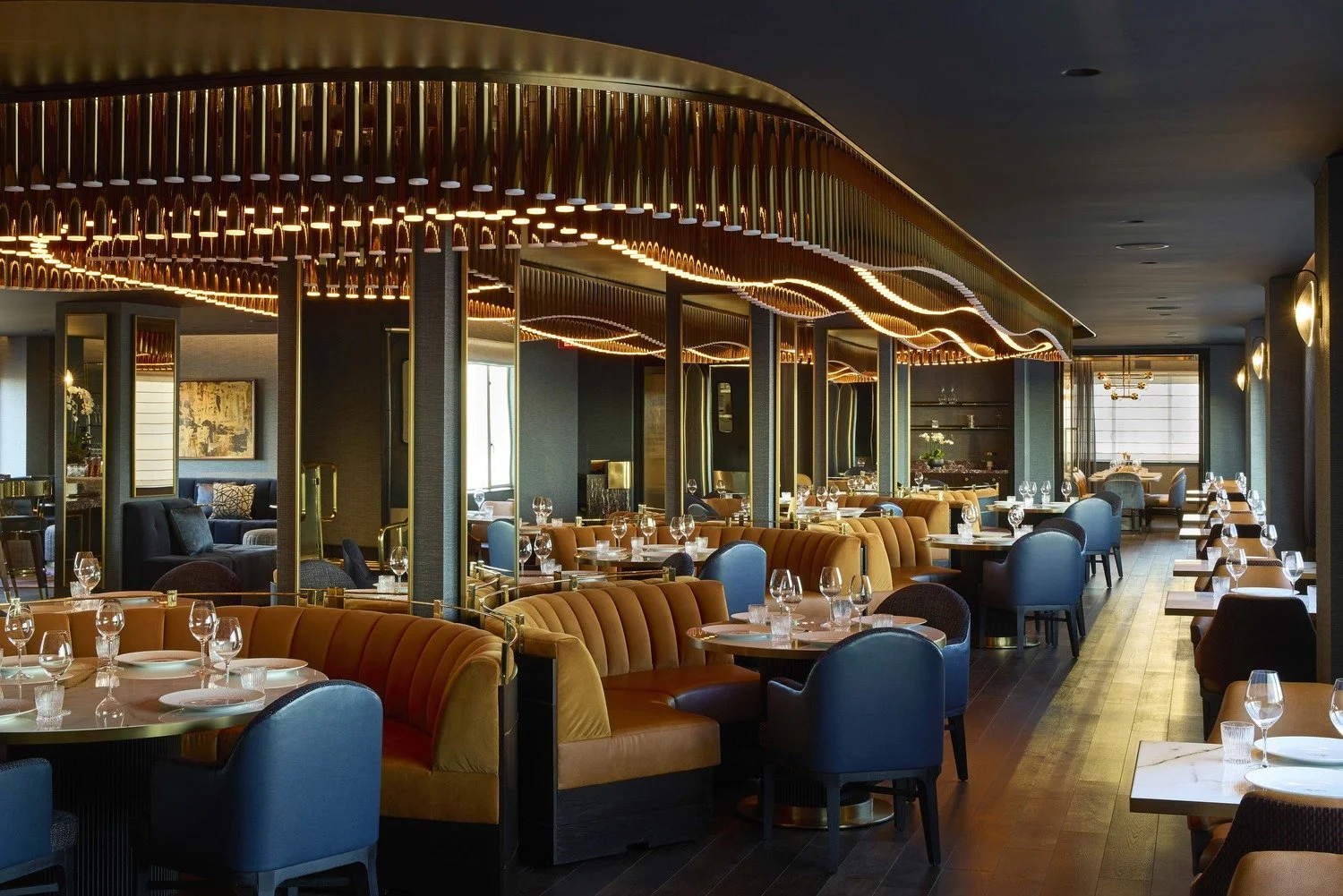 Where some restorations recreate the past, HBA takes a more evocative route: designing with the ocean as muse. Deep blues, warm golds, and shimmering metallics thread through the interiors, capturing the dance of sunlight on water and grounding the experience in the building’s coastal DNA.